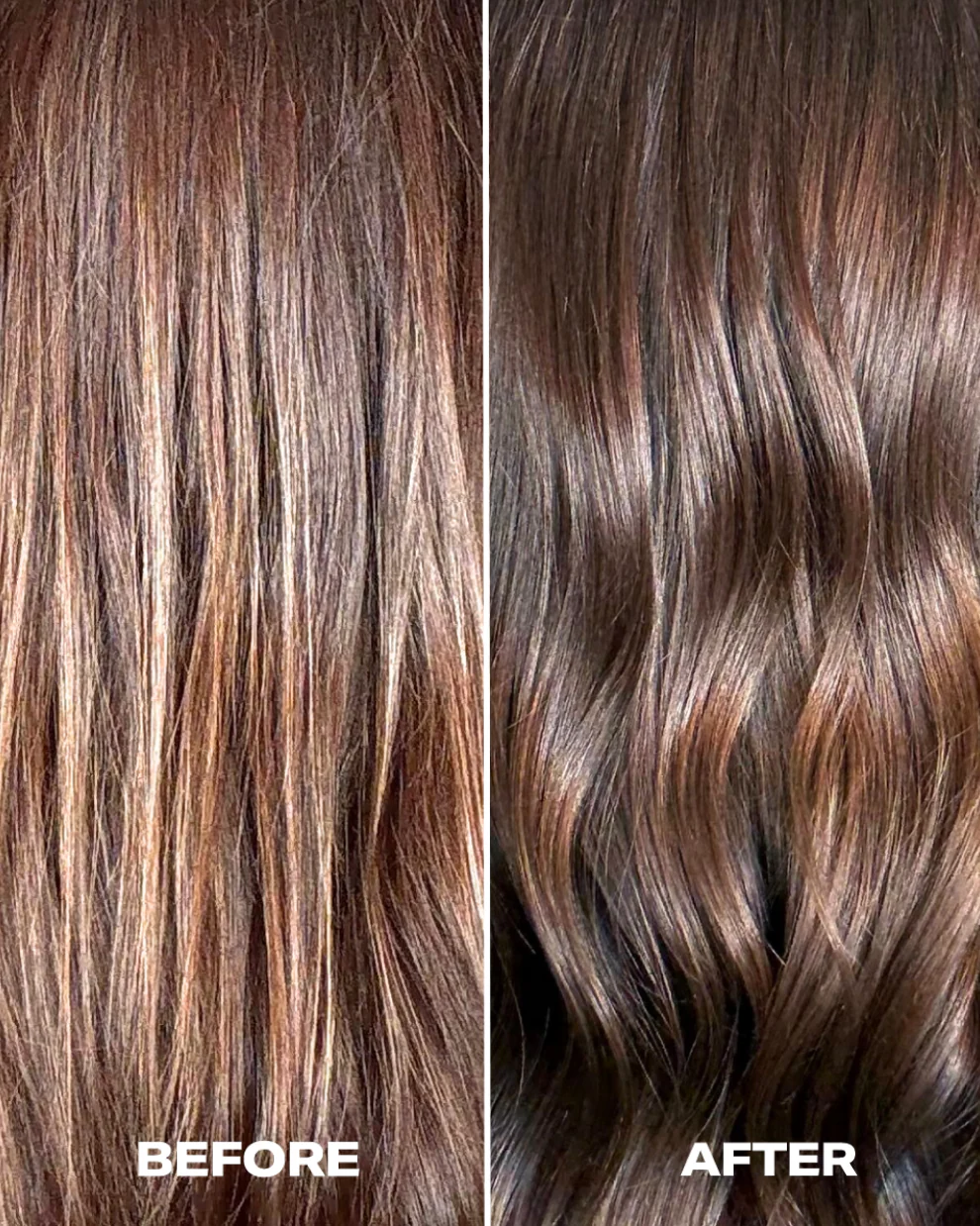 Model wears 6 drops Warm Brunette + 2 drops Copper, mixed into SHRINE Conditioner.